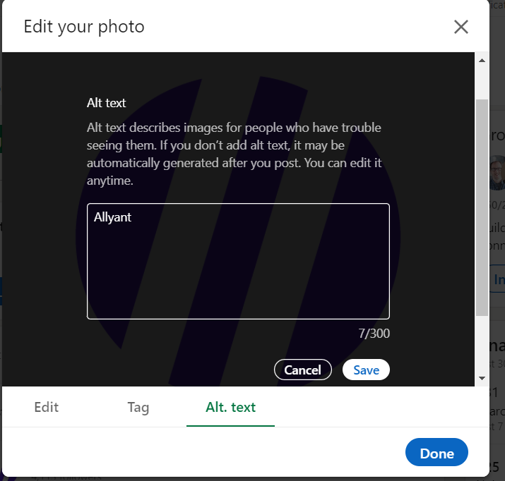 Below is a screenshot showing where to add alt text to an image uploaded to a LinkedIn post.